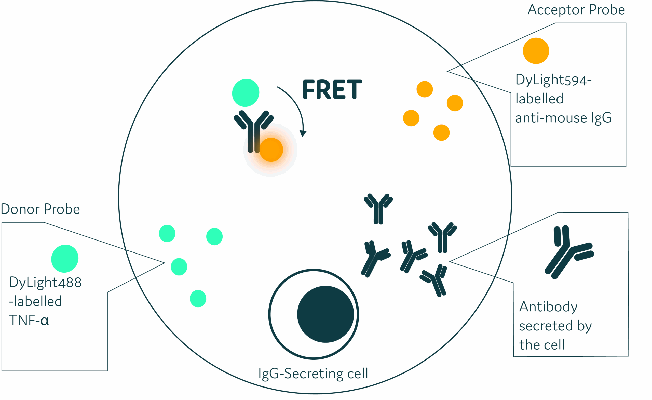 Figure 1: Schematic diagram for antigen-specific specific Förster Resonance Energy Transfer (FRET) assay. This method directly evaluates antigen-specificity of secreted antibody by using FRET, whereby the FRET donor (DyLight488 labelled antigen) is paired with a FRET acceptor (DyLight594 labelled anti-mouse IgG). A FRET response is only detectable when the two FRET probes bind antigen-specific secreted antibody and form a three-molecule complex.